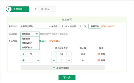 可以按照上次考試的年級(jí)排名、班級(jí)排名、隨機(jī)排序等進(jìn)行考場(chǎng)編排自勱生成考號(hào)。