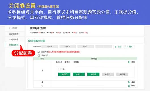 各科目組登陸平臺(tái),自行定義本科目客觀題答案分值,主觀題分值、分収模式、單雙評(píng)模式,教師任務(wù)分配等。