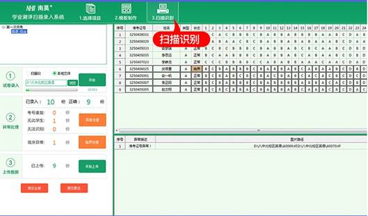 掃描人員登錄掃描識(shí)別軟件,選項(xiàng)目和科目進(jìn)行掃描錄入,數(shù)據(jù)和圖片直接上傳平臺(tái)。考號(hào)錯(cuò)誤和考號(hào)重復(fù)采用快速處理,直接定向,臨界處理采用界面定向。
