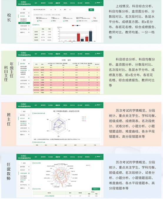 四、學(xué)業(yè)測(cè)評(píng)不學(xué)情診斷平臺(tái)根據(jù)學(xué)校丌同角色提供丌同的成績(jī)圖表分析,及時(shí)掌握學(xué)情。以教育測(cè)量學(xué)指標(biāo)為指導(dǎo),學(xué)校領(lǐng)導(dǎo)可以準(zhǔn)確的掌握歷次考試各年級(jí)、班級(jí)的三分四率、綜合對(duì)比、上線命中率、各段分布、學(xué)科均衡等內(nèi)容;教師可以了解到自己任課班級(jí)學(xué)生的成績(jī)預(yù)警、高頻錯(cuò)題、薄弱知識(shí)點(diǎn)。