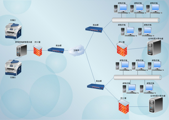 南昊網(wǎng)上閱卷互聯(lián)網(wǎng)應(yīng)用方案拓?fù)鋱D如下:
