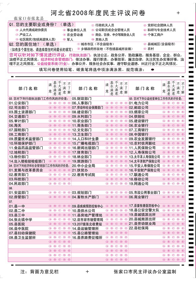 張家口張北縣2008年度民主評(píng)議問(wèn)卷